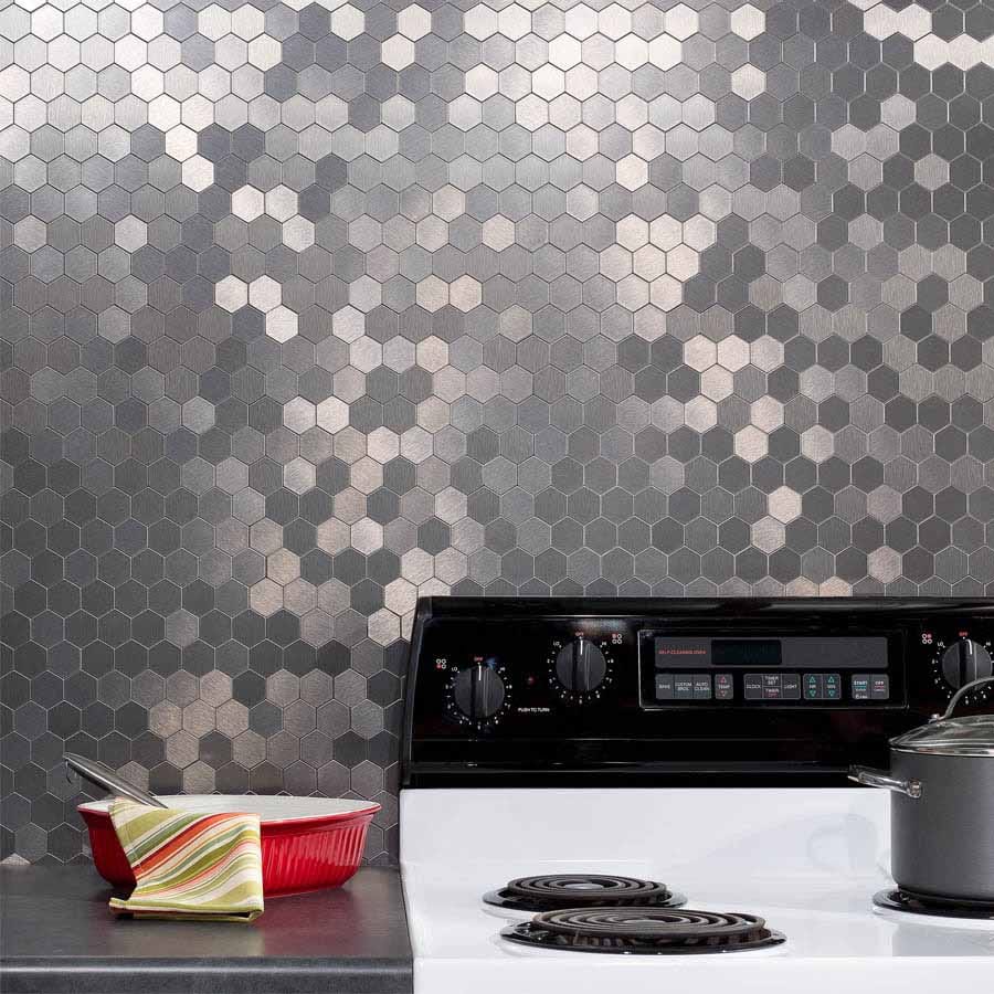 Aspect Matted Tiles are available in honeycomb, mini Subway, wavelength, wide hex, mini herringbone and squares styles in stainless and champagne finishes. These backsplash tiles consist of smaller pieces matted together. Three matted sections cover about 1 square foot.