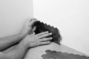 The adhesive on the back side of the Aspect tiles is engineered to be both highly-aggressive and pressure-sensitive (figure 1). Proper wall preparation is required. Aspect can be installed over most structurally sound substrates if they are clean, flat, smooth, dry, and free of dust, wax, soap scum and grease. Acceptable substrates are drywall, plaster or clean, smooth tile (glazed, porcelain type tile; not porous or textured). Any damaged, loose or uneven areas must be repaired, patched, leveled and primed. Fill cracks and irregularities with wallboard compound or spackling, then sand smooth with fine-grit sandpaper.