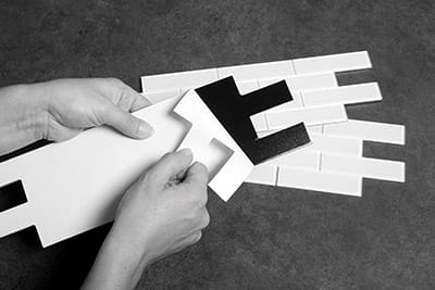 Measure the first area to be covered by Aspect material. We recommend you lay out the entire project on a flat surface, like the counter top, a table or the floor, before adhering to the substrate, to be sure you have enough tiles and your design and layout is correct. This will also give you good reference as to how the tiles will look on your wall. As each project is different, be sure to plan for cutouts, corners or edge treatments before applying tiles.