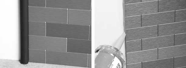 To finish the edges of your tile backsplash, Aspect trim is available to match every tile finish. A second option is to seal the outside edges with caulk using the same materials and method used to seal the gap under the bottom row of tiles (figure 11).
