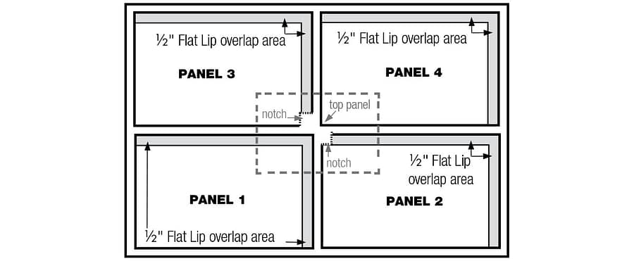 - Understand the overlap feature. Prior to installation, it is important to understand the overlap feature of each panel. Each panel has two 1/2″ flat edges (the longer flat edge is the top of the panel and shorter flat edge is the right side of the panel). Arrange all panels this way so additional panels can be added to the top or right side of any panel. Where 4 panels intersect. When overlapping 4 panels, it is necessary to cut a 1/2″ notch in panels 2 and 3 to avoid an overlap buildup that causes a “bump.” (See drawing below)
