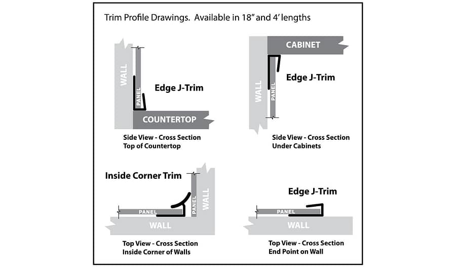 - Finish the edges. If the area to be covered ends on a flat wall, and you desire to finish the cut edge of the last panel, use a piece of matching Edge J-Trim. This trim piece slides over the cut edge of the panel. Also, if you have an inside corner, it is recommended you use a piece of matching Inside Corner Trim. (See trim profile drawings below). You should slide the J-trim and corner trims onto the edge of the panel before beginning our backsplash panel installation. Note: Instead of using trim, you can also finish your edges with caulk.