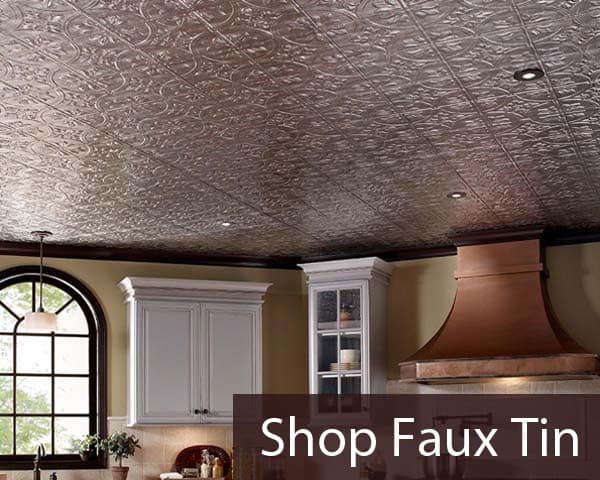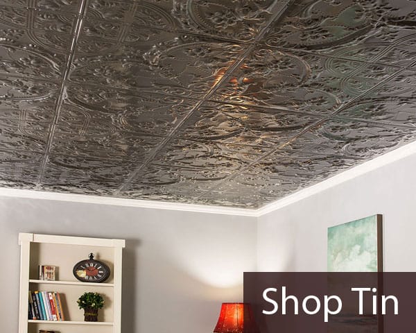 Materials Performance Vinyl Performance vinyl ceiling panels are guaranteed not to water-stain, bow, swell or rot. They are ideal for use in moist and humid areas. Faux Tin Faux tin ceiling panels are offered in numerous styles and designer colors to accent or complement any decor scheme Tin These tin ceiling products are made of 29-gauge tin-plated steel and are easily applied with nails, screws or glue.