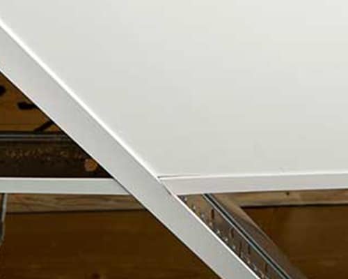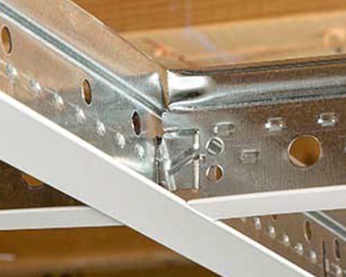 Hook-style grid systems, like the Armstrong Prelude, result in a flat alignment of the main and cross-tees. Ceiling tiles in hook systems usually don’t show raised corners. See image below.