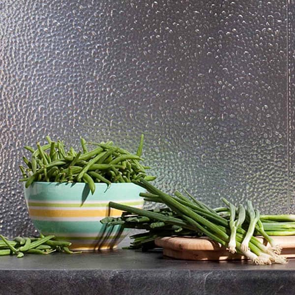 This Hammered panel design replicates a hand-hammered metal style and is perfect for a subtly patterned backsplash. This style of panel uses Standard Profile trims.