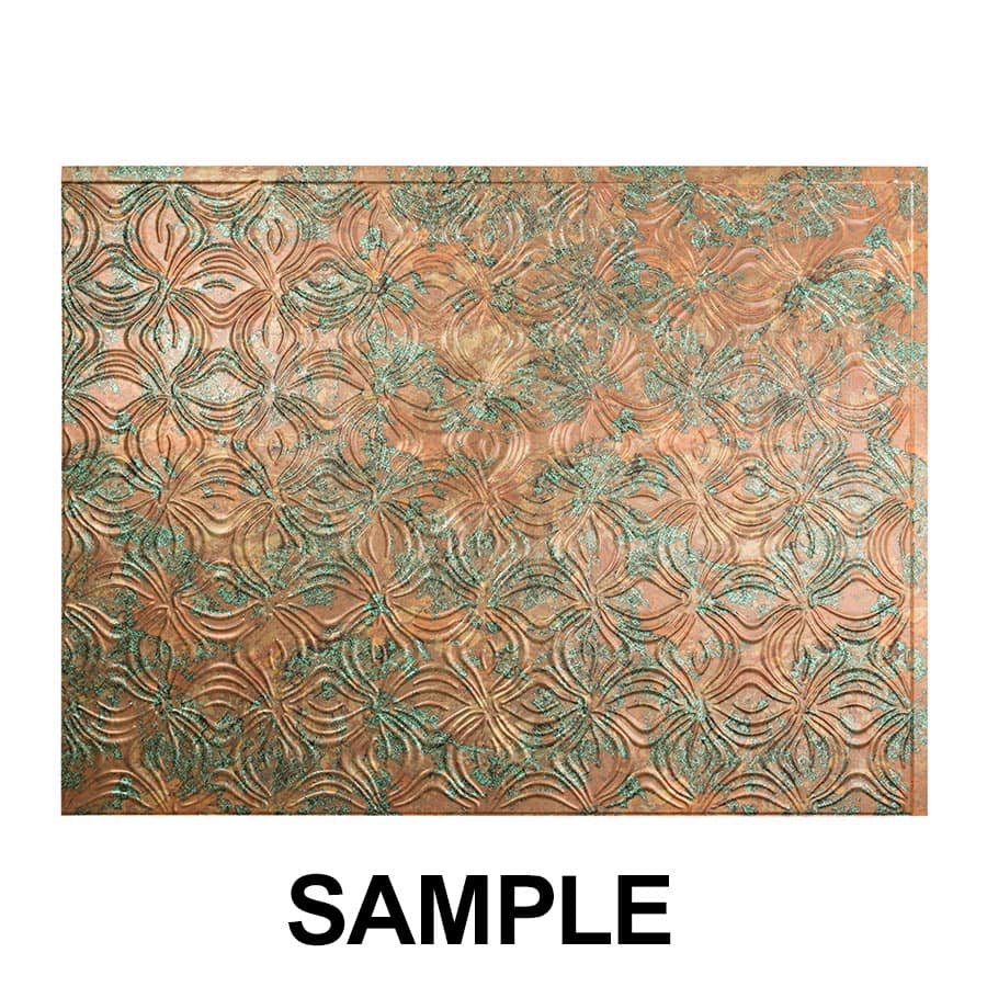 The Lotus backsplash features organic floral leaf elements that embellish this playfully modern kitchen backsplash panel design. This style of panel uses Standard Profile trims.