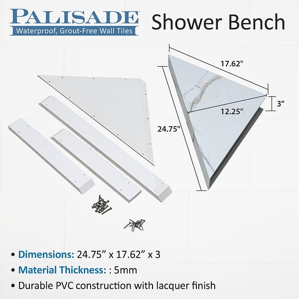 The Palisade floating bench perfectly matches our Palisade finishes to add functionality and style to any Palisade shower installation. Made of durable PVC with a lacquer finish for lasting strength and easy maintenance, the bench kit installs quickly and easily over Palisade tiles.