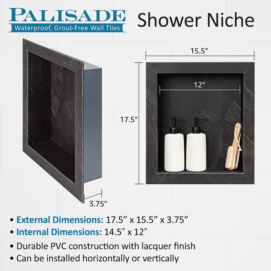 The Palisade shower niche perfectly matches our Palisade finishes to add functionality and style to any Palisade shower installation. Made of durable PVC with a lacquer finish for lasting strength and easy maintenance, the niche kit installs quickly and easily over Palisade tiles.