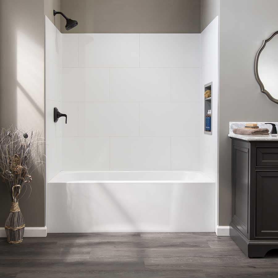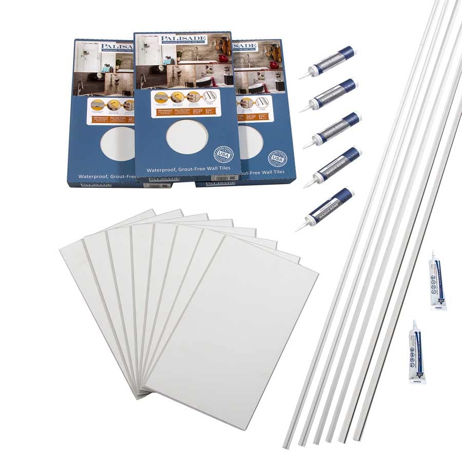 Each kit contains enough product to cover the typical tub or shower surround. 11″x23″ tile kits contain 40 tiles (4 packs of 10). 15″x26″ tile kits 32 tiles (4 packs of 8). Also included: