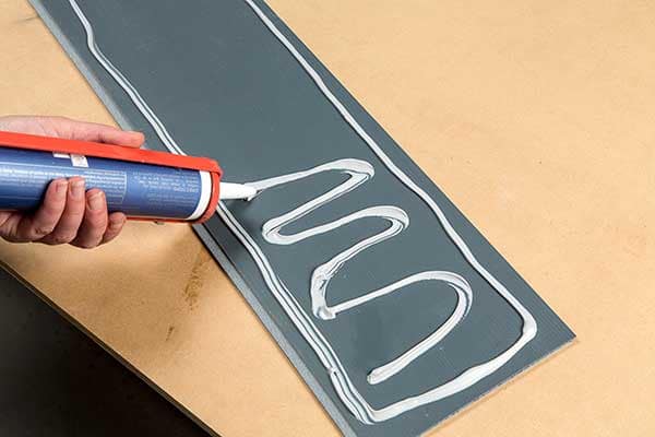 Apply adhesive to the back of the plank. Carefully read and follow adhesive manufacturer’s directions. Apply a 1/4-inch bead in a typical “M” or “W” pattern, and a bead around the plank perimeter about 1-inch in (image L).